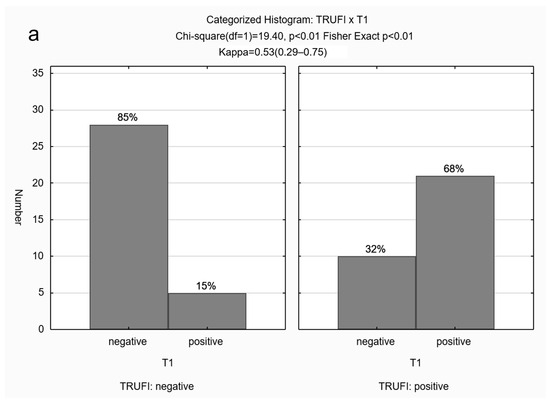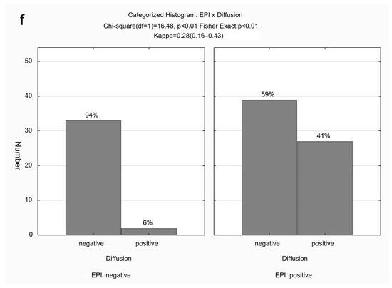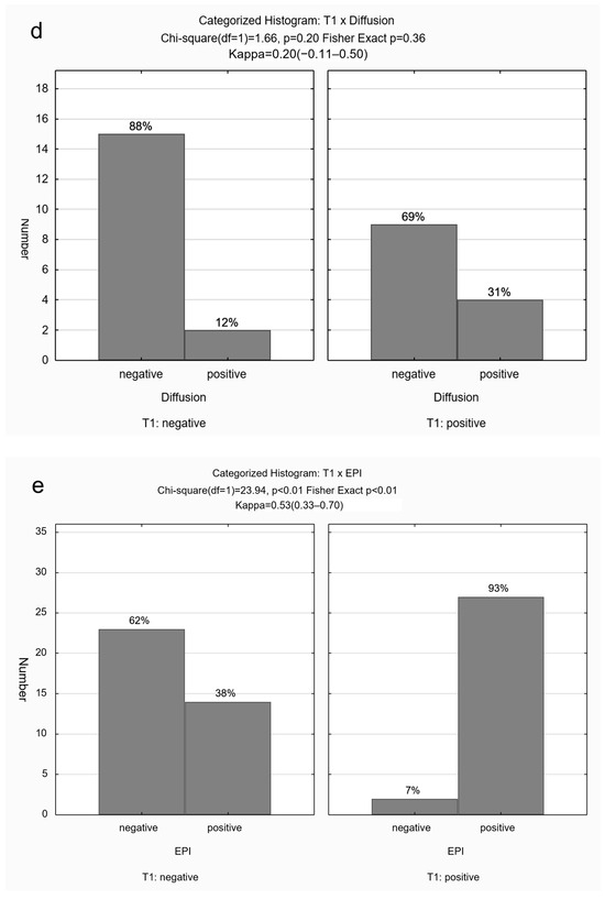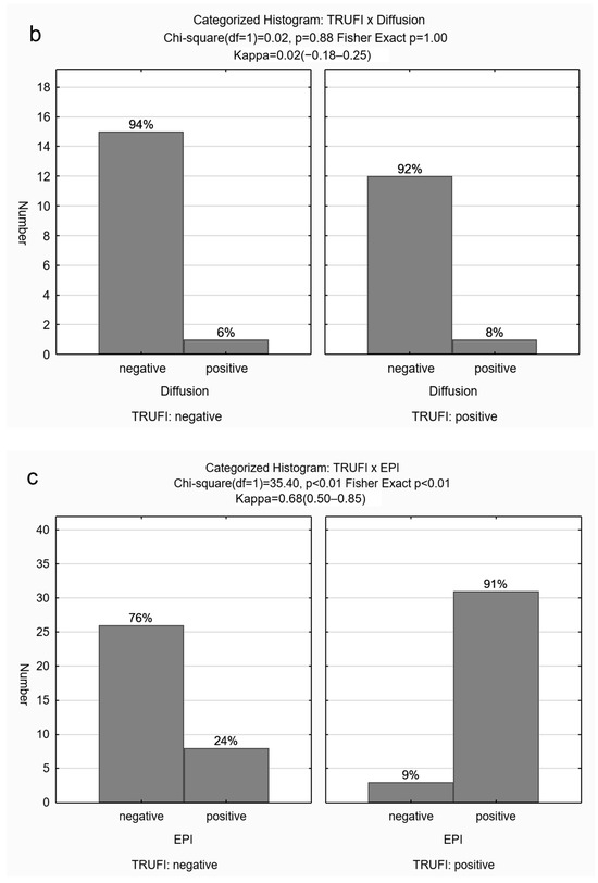 (a–f) Categorized histograms for demonstrating agreement among the different sequences. TRUFI and EPI (c) demonstrated substantial agreement (κ = 0.68; p < 0.01); TRUFI and T1 (a) and T1 and EPI (e) demonstrated moderate agreement (κ = 0.53; p < 0.01); EPI and diffusion (f) demonstrated fair agreement (κ = 0.28; p < 0.01).