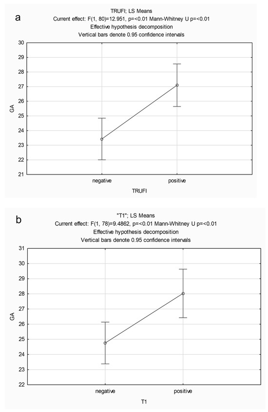 The median gestational age was 24 weeks (IQR 22–30 weeks). Based on median age (24 weeks), 82 were above 24 weeks of gestational age (GA) and 85 were 24 or younger. Table 2 provides median and IQR of GA for each sequence and demonstrates that fetuses with a positive BFS were significantly older than those without (mean GA of 27 weeks or higher), for each sequence (Figure 6). The median maternal age was 32.2 years (IQR 28.1–35.9 years) and there was no statistically significant association of maternal age with the positive BFS for any of the sequences (p > 0.05).
