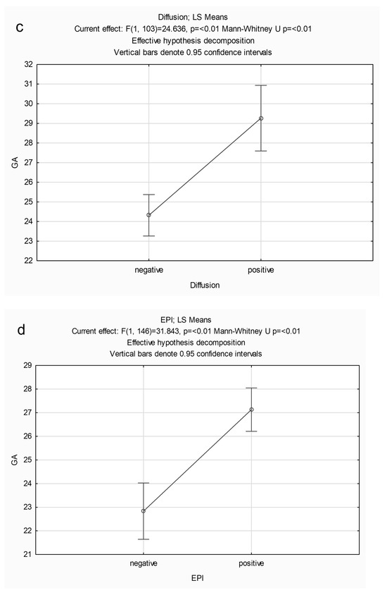 (a–d) Least squares means (LS Means) of gestational age (GA) for different sequences. The mean GA was 27 weeks or higher for scans with a positive buccal fat pad sign for the different sequences.