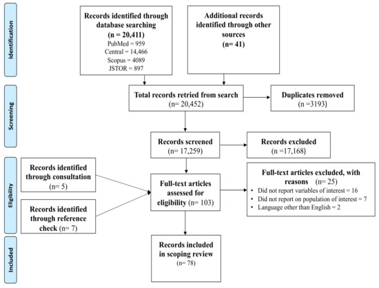 The initial search conducted across the four main databases yielded a total of 20,411 records. This number was complemented by an additional 41 records from other online sources. The Mendeley software was used to eliminate 3193 records. The screening of the title led to the exclusion of 17,168 records. Thus, 91 full-text eligible records were left for further screening. An additional five records were obtained through consultation with a librarian, and seven more records were discovered by scrutinizing the reference lists of the full-text eligible records. Finally, 103 full-text records underwent screening against the predetermined eligibility criteria. Ultimately, 78 full-text records met the inclusion criteria and were included in this scoping review. Refer to Figure 1 for detailed information on the screening process.