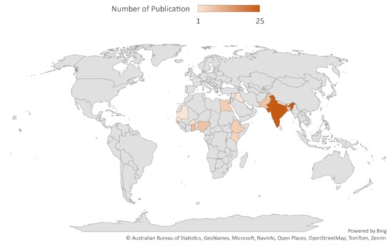 Most of the included studies were conducted in India (n = 25), followed by Ghana (n = 8) (see Figure 2 for details). The majority of the studies included in this review used cross-sectional survey design (n = 76). The rest were experimental (1) and case–control (1) studies. See the Supplementary Table (Table S1) for details on extracted data from included studies.