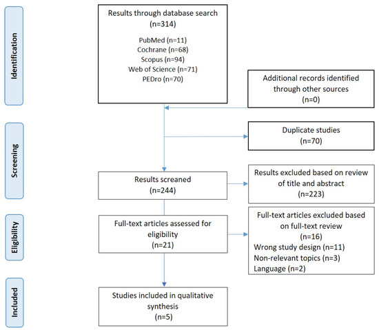 A total of 314 studies were retrieved from the five databases searched. A total of 70 duplicated studies were discarded, leaving 244 studies for peer review. After reading the titles and the abstracts of the potentially relevant articles, 223 articles were excluded. Of the 21 studies selected to assess their eligibility for a full-text reading, 11 studies were discarded due to not accomplishing the criteria of study design (pilot studies, posters, conference abstracts, clinical trial registries), 3 studies were discarded because the aims were irrelevant for the review and 2 studies were discarded because they were written in a language other than Spanish or English. Therefore, 16 studies were excluded, and the final sample was of five articles [28,29,30,31,32]. The selection process is shown in the flowchart seen in Figure 1.