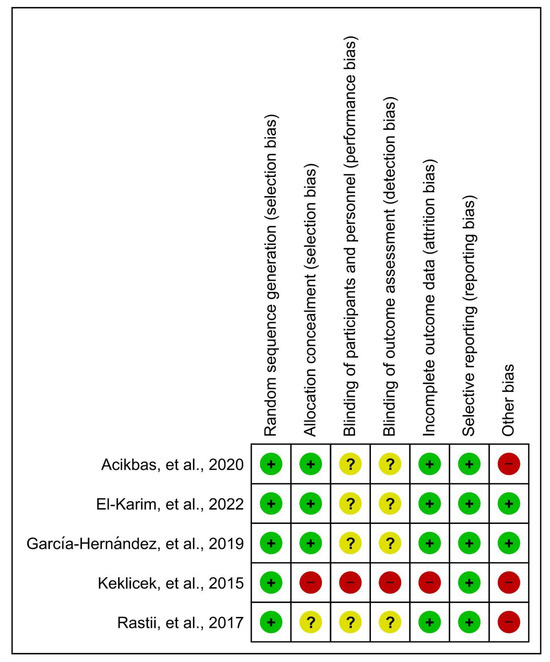 Review Manager (RevMan 5.4.1) was used in all studies. All of them [28,29,30,31,32] showed a low risk for random sequence generation. In the allocation concealment, one study showed high risk [29], one study unclear risk [28] and three studies showed low risk [30,31,32]. Regarding the performance and detection bias, one study showed high risk [29] and the other four studies unclear risk [28,30,31,32]. Regarding participants and personnel blinding, one study showed high risk [29] and four studies an unclear risk [28,30,31,32]. Related to attrition bias, four studies showed low risk [28,30,31,32] with one study showing high risk [29]. All studies showed low risk for reporting bias [28,29,30,31,32]. Other biases with high risks were those related to the lack of homogeneity in the sample at the beginning [28,29] and to the subjective evaluation of some parameters [31], while studies [30,31,32] showed low risk (Figure 2).