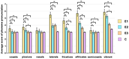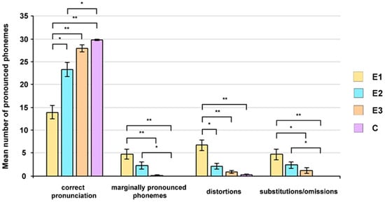 Pronunciation of phoneme groups by patients from groups E1, E2, and E3 and their peers from the control group using the global articulation test. Results are presented as the mean ± standard error of the mean (SEM). Differences between the groups were estimated by a Dunn–Bonferroni post hoc analysis (* p < 0.05, ** p < 0.001).