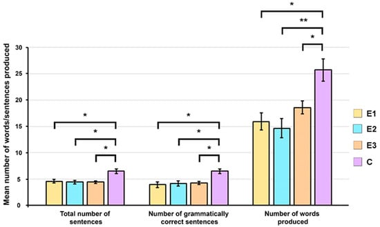 Patients from groups E1, E2, and E3 produced a smaller number of grammatically correct sentences compared to the control subjects (Figure 3). The Kruskal–Wallis test showed that the differences between the groups were statistically significant (p < 0.01). The Dunn–Bonferroni’s post hoc test revealed statistically significant differences in the number of grammatically correct sentences produced between the patients from groups E1, E2, and E3 and children from group C, while statistically significant differences were not observed between the patients from the E1, E2, and E3 groups (Figure 3).
