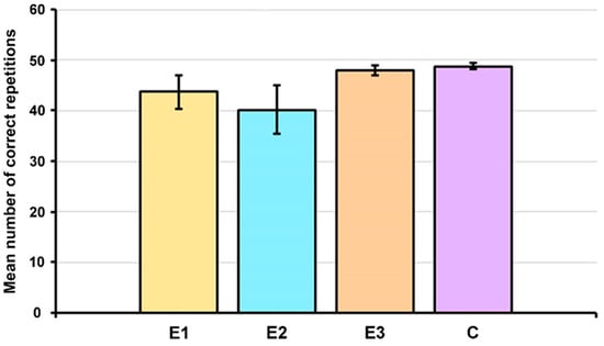The next step in the investigation of the speech and language abilities of patients from the E1, E2, and E3 groups and control subjects included the assessment of immediate verbal memory using the verbal memory test. There were no statistically significant differences in the number of correct repetitions between the analyzed groups of children (Figure 4), indicating their similar ability to use verbal memory.