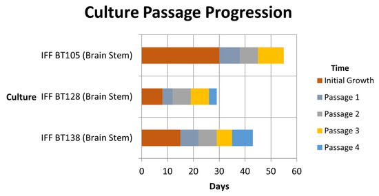 Fresh, sterile tumor tissue was minced and enzymatically dissociated in 5 mL Accutase (Gibco, Grand Island, NY, USA) per 1 mL tissue at 37 °C for 10–20 min until it consisted of mostly individual cells assessed by inverted microscope. This mixture was diluted with DPBS without Ca2+ or Mg2+ (Gibco, Paisley, UK) and strained through a 40 micron mesh strainer. The strained mixture was centrifuged at 200× g for 10 min. The pellet was re-suspended in RBC lysis buffer (Miltenyi Biotec, Bergisch Gladbach, Germany) for 5 min, centrifuged, washed in serum-free media, and centrifuged again. The cell pellet was re-suspended in supplemented serum-free growth media and incubated at 37 °C in a 5% CO2 atmosphere as described in Lin and Monje, 2017 []. Each cell culture was dissociated and re-suspended when the neurospheres approached 100 µm in diameter. Passages occurred at differing times among the tumors due to the rapidity with which they grew. A graph demonstrating the passage progression is shown in Figure 1. At each passage, cells were frozen and placed in storage. A total of 98 frozen aliquots of cells were available from these cell cultures to be used by investigators.