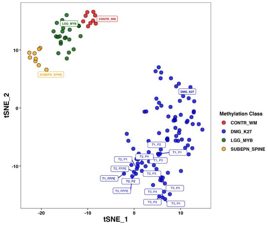 All 14 of the tested samples clustered on the tSNE plot among which the known reference H3 K27M-mutant midline gliomas are separate from the nearest other clusters. T = tumor no., FFPE = biopsy, P = culture passage no.