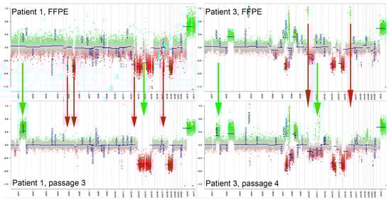Copy number plots: Initial patient FFPE samples are on top, and the corresponding final culture passages are below. Green arrows indicate copy-number changes gained in culture, and red arrows indicate changes that were lost in culture. Gain of 1q in culture, demonstrated by the green arrow on the left side of each image, was the only change in common between the two. Tumor 2 had gain of 1q in all tested samples.