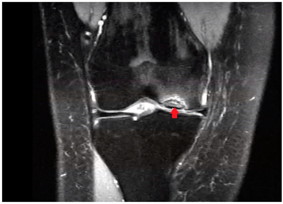 OCD of the medial femoral condyle as seen on an MRI (coronal view, T2-weighted). The arrow indicates OCD of the medial condyle of the femur.
