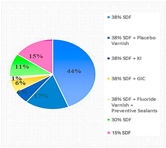 In order to evaluate SDF effectiveness authors proposed different associations: KI, glass-ionomer cements (GIC), fluoride varnish or dental sealants (Figure 1).