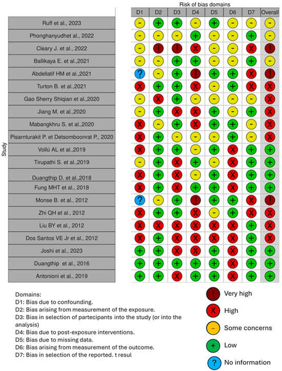 The risk of bias in the included studies is reported in Figure 3. Regarding the bias due to confounding most studies have a high risk. The bias arising from measurement is a parameter with low risk of bias. Many studies have a low risk of bias due to bias in selection of participants. Bias due to post exposure cannot be calculated due to high heterogeneity. The bias due to missing data is low in many studies. Bias arising from measurement of the outcome is low. Bias in the selection of the reported results is high in most studies. The final results show that eight studies have a high risk of bias, two have a very high risk of bias and four have a low risk of bias [63].