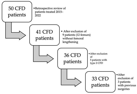 Approval from the institutional bioethics committee was obtained to carry out this study. We have performed a retrospective review of 50 patients (53 femurs) presenting with CFD and treated between 2014 and 2023. The diagnosis of CFD was made by a pediatric orthopedic surgeon with experience in congenital limb deformities based on clinical and radiological appearance. The inclusion criteria were as follows: (1) type 1 CFD according to Paley classification, (2) availability of full radiographic and clinical data, (3) no previous surgical treatment, (4) two-stage reconstruction surgery consisting of hip reconstruction followed by femoral lengthening using an external fixator, and (5) minimum 1-year follow-up after external fixator removal. Based on these criteria, we have excluded the following: 9 patients (12 femurs) who have not undergone femoral lengthening yet; 3 patients who have previously had surgical treatment (hip joint reconstruction or femoral lengthening) performed in another department (they were referred to our department to treat complications); and 5 patients with Paley type 2 CFD (3 with 2a, 1 with 2b and 1 with 2c type). The flowchart presenting the inclusion process is presented in Figure 1. Finally, the analysis concerned 33 patients (37 femoral lengthenings), all with CFD type 1a according to Paley classification.