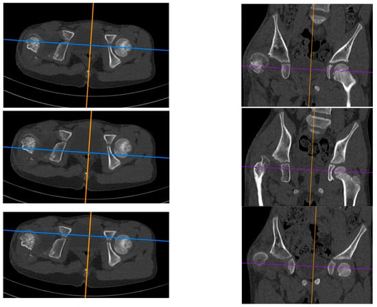 CT examination of patient with right hip dislocation. Left: transverse view, right: coronal view. Evaluation of medial (first row), posterior (middle row), and anterior (last row) parts of the acetabulum.