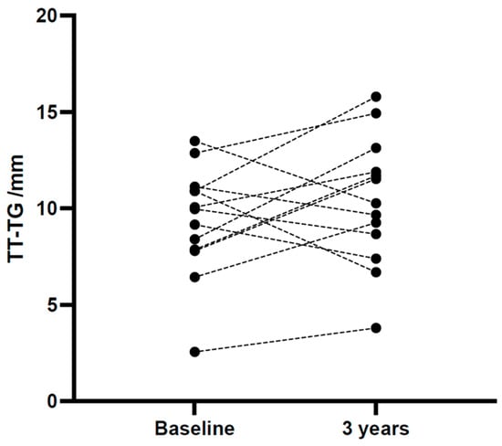 We found an average measure interrater ICC for TT-TG of 0.908 with a 95% CI from 0.820 to 0.956, indicating high reliability [18]. We, therefore, used the mean measurements of the three raters in further analysis. The absolute change in TT-TG distance from baseline to the three-year follow-up was (2.9 mm (95% CI 2.1–3.7). A change in TT-TG distance was found for all patients. Furthermore, the change in TT-TG distance could go in either direction, as illustrated in Figure 2. The TT-TG distance decreased in five of the 13 adolescent patients during the three-year study period (Figure 3).