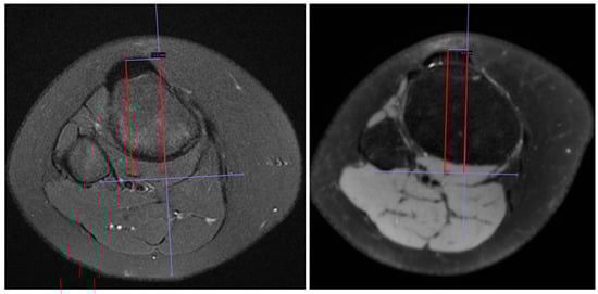 The measurements were performed by three raters (one senior musculoskeletal radiologist (HB) and two experienced orthopedic surgeons (TSN and PHR). The measurement method was agreed upon in a joint meeting between the investigators before the measurements. The measurements were conducted independently, and the raters were blinded to each other. TT-TG measured on superimposed axial CT images was initially described by Dejour [16] and has later been validated for MRI [17]. According to Schoettle et al. [17], the TT-TG distance was measured by all three authors using the integrated measurement tools in a Picture Archiving and Communication System (PACS, Carestream Health Inc., ver. 12.2, Rochester, NY, USA). Two key images on axial fat-suppressed PD sequences were selected and saved, the first at the most posterior border of the femoral condyles and the second at the level with the most anterior point of the tibial tuberosity. On the first key image, a tangential line was drawn to the posterior bony borders of the femoral condyles. In the next stage, a perpendicular line was drawn from the first line, passing through the deepest bony point of the trochlear grove. The distance between the second line and the most anterior point of the tibial tuberosity was measured as the TT-TG distance (Figure 1).