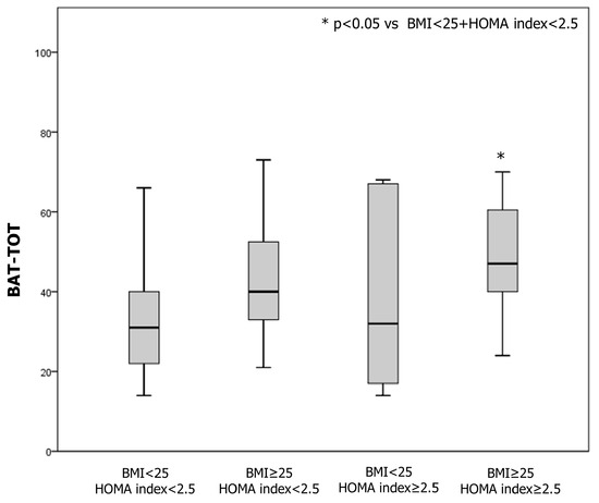 Patients were also divided into four subgroups based on BMI and IR: (1) normal weight without IR (BMI < 25 and HOMA index < 2.5); (2) overweight without IR (BMI ≥ 25 and HOMA index < 2.5); (3) normal weight with IR (BMI < 25 and HOMA index ≥ 2.5); and overweight with IR (BMI ≥ 25 and HOMA index ≥ 2.5). A statistically significant difference in body image distress was found in these subgroups (Figure 1 and Table 3). No statistically significant differences were found between androgen levels in patients with IR and without IR, and by BMI. Patients with overweight and IR also showed poorer scores in the following subgroups of the BAT compared to patients without obesity and IR: “negative appreciation of body size”, “lack of familiarity with one’s own body”, and “general body dissatisfaction” (Supplementary Table S1).