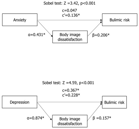 Results from the Sobel test for mediation. Illustration of Sobel coefficients for the mediation of body image dissatisfaction in the relationship between anxiety and bulimic risk and between depression and bulimic risk. The coefficients α, β, and c are Sobel coefficients. Specifically, α = direct effect of the independent variable on mediator; β = effect of the mediator on the dependent variable; c = direct effect of the independent variable on the dependent variable; and c′ = total effect of the independent variable on the dependent variable. * The figure shows that body image dissatisfaction mediated the relationship between anxiety and bulimic risk and between depression and bulimic risk in adolescents with PCOS.