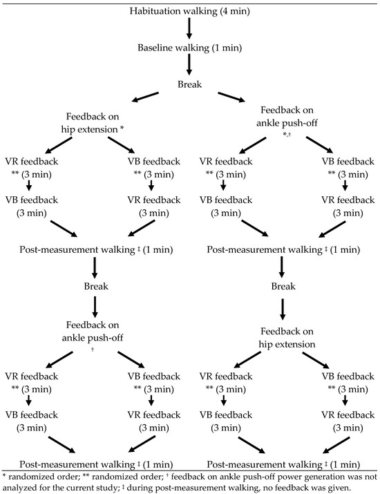 Therefore, the aim of the current study was to evaluate and compare the immediate effects of VB and VR feedback on hip extension during treadmill training in children with CP. We first hypothesized that walking on a treadmill with VB or VR feedback in children with CP results in improved gait (i.e., closer to the gait pattern of TD children) when compared to walking on a treadmill without feedback. Secondly, it was hypothesized that VR feedback leads to better gait outcomes than VB feedback.