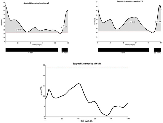 Analysis of sagittal kinematics between different types of feedback conditions on the vector level, with indication of significant clusters. α = 0.0167; VB = Verbal feedback; VR = Virtual Reality feedback; SnPM(T2) = Statistical Non-Parametric Mapping Analysis (Hotteling’s t2-test); Black bar below graphs = cluster within the gait cycle with significant difference between both feedback conditions, based on SPM analysis and exceeding more than 3%; Red dotted line = cut-off above which the difference is defined as significant.