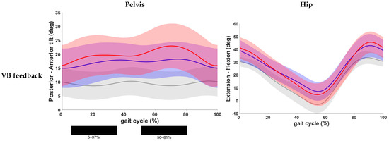 Results of the post hoc analysis are presented in Table 3. Continuous waveforms of pelvic and hip kinematics are shown in Figure 4. At the level of the pelvis, a statistically significant increase in anterior pelvic tilt was found at the end of loading response and during midstance, as well as during the pre- and initial swing phase in both feedback conditions compared to the baseline condition (p < 0.001). No significant difference was found for pelvic kinematics when comparing both feedback conditions. Hip extension did not change significantly after VB feedback. VR feedback, however, yielded a significantly improved hip extension during terminal stance when compared to baseline (p < 0.001). Yet, no significant change was seen between both conditions.