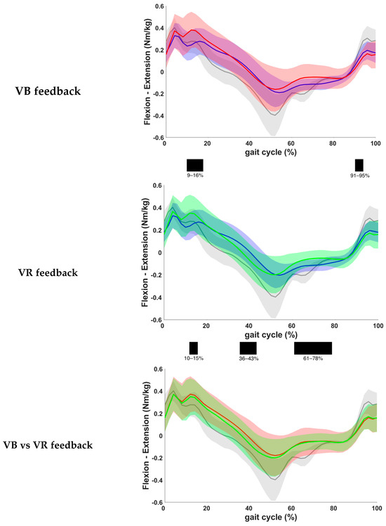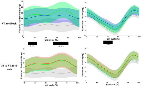 Results of the analysis of sagittal plane kinematics on a vector-level (i.e., combining all sagittal joint motions) are shown in Figure 3. A statistically significant improvement was observed both after VB and VR feedback (p < 0.001) when compared to the baseline gait curve, except during the midswing phase. The observed difference between VB and VR feedback did not exceed the predefined critical p-value (p = 0.02).