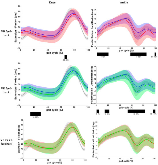 Comparison of kinematic waveforms of the knee and ankle during the different feedback conditions, with indication of significant clusters in the gait cycle. Red = VB feedback; green = VR feedback; blue = baseline; grey = normative data of typically developing children; light red, green and grey zones = ±1 standard deviation; black bar below graphs = cluster within the gait cycle with significant difference between both feedback conditions, based on SPM analysis and exceeding more than 3%. Definition of Y-axis is indicated in the graph as (negative)–(positive) values.