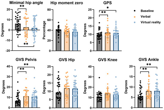 Results of discrete gait parameters are presented in Figure 7. At baseline, the median minimal hip angle was 6.15° (IQR −0.61–12.11). This angle decreased to 1.35° (IQR −4.34–11.28) after VB feedback and to −0.40° (IQR −3.95–9.03) after VR feedback. The improvement was found to be statistically significant both after VB and after VR feedback when compared to baseline. There was no statistically significant difference between VB and VR feedback conditions.