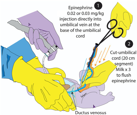 Vali, P.; Chen, P.; Giusto, E.; Lesneski, A.; Hardie, M.E.; Knych, H.K.; Sankaran, D.; Alhassen, Z.; Joudi, H.M.; Lakshminrusimha, S. Direct Umbilical Vein Injection of Epinephrine with Cut-Cord Milking in an Ovine Model of Neonatal Resuscitation. Children 2024, 11, 527. https://doi.org/10.3390/children11050527