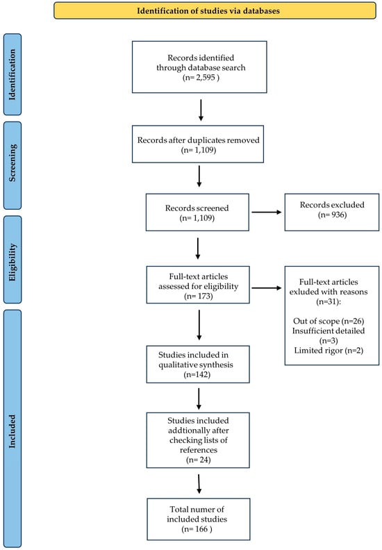 This paper is in narrative form and is based on both original and review articles written in English and indexed in Medline, Scopus, Web of Science, and Google Scholar databases, selected for their relevance in describing the chosen scientific topic. These databases were searched up to November 2023 with the use of the following terms: ‘fetal alcohol spectrum disorders’ and ‘animal models’ or ‘dietary supplements’ or ‘vitamin supplementation’ or ‘postnatal intervention’ or ‘diet therapy’ or ‘drug therapy’ or ‘prevention and control’ or ‘rehabilitation’ or ‘postnatal supplementation’ or ‘therapy’ or ‘postnatal care’ or ‘Drosophila melanogaster’. The evaluation of titles and abstracts was carried out by two reviewers independently, with a focus on the key research related to the main topic. Any disagreements in assessing the articles were discussed to reach unanimous consensus. We decided to include both original studies and review articles. Moreover, we checked the lists of references of the included papers for additional relevant articles. Full-text articles were obtained on the basis of their significance to the study. The flow chart of the publication selection process is shown in Figure 1.
