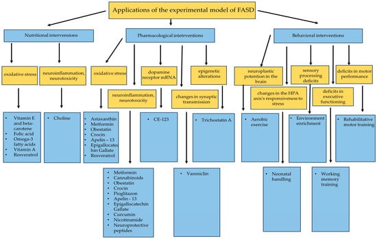 Below, there are described the main interventions, including the nutritional, pharmacological, and behavioral approaches that were studied using the experimental animal models of FASD. The mechanisms responsible for producing harm in FASD have not been completely understood yet. Nevertheless, oxidative stress may be one of the underlying causes []. So far, the conducted research has demonstrated many strategies to combat FASD by either preventing or reducing oxidative stress. This is one of the main mechanisms of many nutrients and drugs associated with the reduction in NADPH level, the increase in a crucial antioxidant—glutathione, the increase in the level of the ADH enzyme, or the reduction in lipid peroxidation. Another important mode of action for both nutritional and pharmacological strategies is the reduction of neuroinflammation and neurotoxicity by reducing levels of pro-inflammatory cytokines. Additionally, it was also observed that certain pharmacological agents may have an impact on epigenetic alterations, changes in synaptic transmission, or dopamine receptor mRNA. The last category of intervention included in the presented review concerns the behavioral strategies. It comprises various activities targeting neuroplastic potential in the brain, sensory processing deficits, deficits in motor performance, changes in the hypothalamic–pituitary–adrenal axis’s responsiveness to stress and deficits in executive functioning. A general summary of the therapeutic interventions effective in reducing serious consequences of PAE that have been studied in animal models is provided in Figure 2.