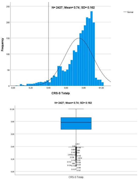 First, a thorough study of the participants’ responses to the CRS items was conducted to clean the database [42,46] and preserve the sample of participants with useful responses to carry out the analysis. We began by identifying all illegitimate cases [42] (p. 85); these were those whose responses were useless for the intended objective, therefore lack value, and add substantial error variance to the analysis [42] (p. 85). Illegitimate cases were considered, such as those arising from non-responses to all scale items, for obvious reasons, and those arising from random response patterns likely to threaten the quality of the measure when carrying out a factor analysis. Random responses are a set of responses where individuals respond with little thought or reflection [49] due to a lack of preparation, reactivity to observation, lack of motivation to cooperate with the test, disinterest, or fatigue [49,50,51,52,53]. In this sense, it was established to reject the responses of those participants who did not respond to 40% or a greater percentage of the items in the CRS questionnaire. The argument is the following: This behavior could be due to a good intention (to respond later in a more reflective way, but never did so), but it could also be due to a lack of motivation and/or commitment to the research for which they had given their consent. On the other hand, of those participants whose response rate was complete, it was decided to eliminate those participants who maintained the same response level in more than 50% of the items (levels 3 and 6 were the most selected).