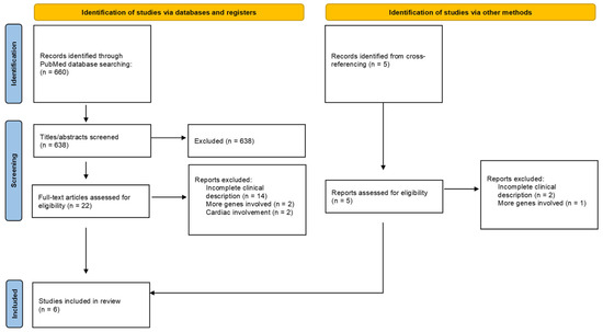 A total of 660 studies from the PubMed database were found. All the studies were screened on the basis of their titles and abstracts, and 22 were retained for full-text analysis, according to our inclusion and exclusion criteria. The reasons for article exclusion are summarized in the PRISMA flowchart (Figure 1). The main reason was an incomplete clinical description. Two articles were excluded due to the involvement of more genes than the only CACNA1C. Five adjunctive studies were added through a cross-referencing process. Of the 27 selected studies for full-text analysis only six were included in our review [10,11,24,26,27,28].