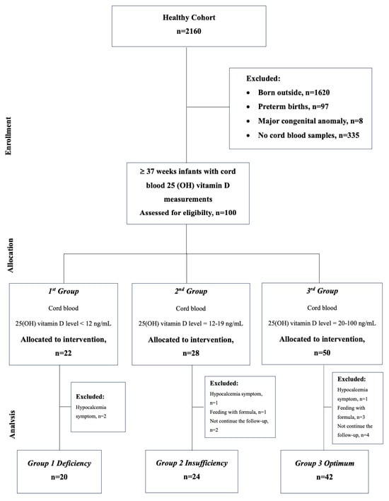 The study included term infants (GA ≥ 37 weeks) born during the same season. Infants with major congenital anomalies or whose cord blood samples could not be taken and for whom family written consent could not be obtained were not included in the study. Infants who required formula in addition to breast milk, did not take routine 400 IU vitamin D supplements (just vitamin D drops, not multivitamins such as A,C, and D), had hypocalcemia or hypomagnesemia during follow-up, or missed follow-up appointments were all excluded from the study. The flow chart of selected eligible infants in the study is presented in Figure 1.