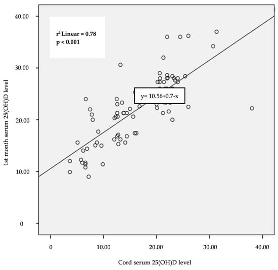 While it is known that maternal serum and cord blood 25(OH)D levels are highly correlated, both maternal serum and cord blood 25(OH)D increase after maternal vitamin D supplementation [,]. In addition to the correlation between maternal serum and cord 25(OH)D levels, studies in the literature have demonstrated a positive correlation between the levels of 25(OH)D in the venous blood of six-month-old infants and cord blood [,,]. As reported in the literature, our study also revealed a significant correlation between cord and 1st month serum 25(OH)D levels. Infants with low cord 25(OH)D levels had also low 1st month 25(OH)D levels. In this study, postnatal standard 400 IU vitamin D supplements were given to all breastfed infants as well as those born with low cord vitamin D due to mothers who did not take adequate vitamin D supplements during pregnancy.