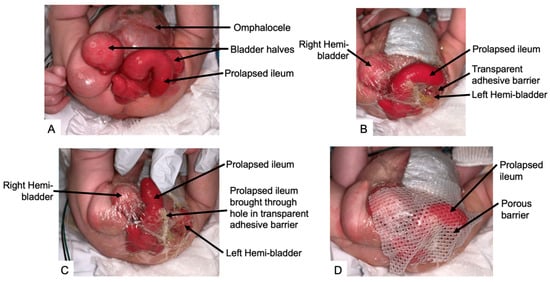 Immediately following birth, stabilization of the newborn, coverage of the exposed omphalocele, bladder, and bowel, and protection of the myelomeningocele should be prioritized. Options for coverage of the bladder and cecal plate mucosa include an occlusive plastic wrap or a hydrated silicone gel dressing (Figure 3). This aids in preventing abrasions from the diaper, keeping bladder plates moist, and decreasing infection risk [6,59]. The umbilical cord should be ligated with suture rather than an umbilical clamp as this can abrade the bladder, cecal plate, and prolapsed ileum [59,60]. Nutrition should be optimized to facilitate growth and development and postoperative wound healing.