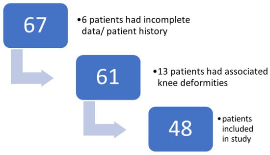 The investigation was conducted at the Pediatric Orthopedics Outpatient Clinic situated within the “Grigore Alexandrescu” Children’s Emergency Clinical Hospital in Bucharest, Romania. This clinic serves as a primary healthcare facility for children in the urban vicinity and its surroundings. Approval for the study was obtained from the hospital ethics committee on 26 September 2023, and the survey was assigned the identification number 14. Written consent was secured from each parent or legal tutor of all participating children. The study covered the period from January 2018 to January 2022 through consecutive sampling. Figure 1 provides a patient flow diagram that outlines the study design and the process of participant selection.