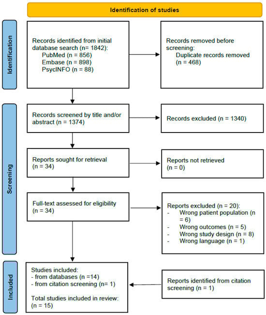 A total of 1842 records were identified in the literature search (PubMed n = 856, Embase n = 898, and PsycINFO n = 88). After duplicate removal, 1374 records were screened based on title and/or abstract. A total of 34 reports were assessed after full-text retrieval, of which 20 reports were excluded, and 14 were determined to fulfill the requirements for inclusion (Kappa of initial agreement = 0.87). Finally, a citation screening of the included studies revealed one further study, leading to the inclusion of a total of 15 studies in the review. The selection process is displayed in Figure 1.