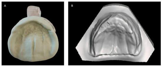 Dental impression of the maxillary arch in addition silicone material (A) and derived virtual plaster model (B).