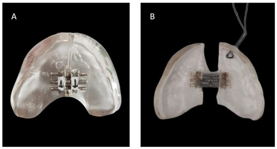 Appearance of the NPEP orthodontic appliance before activations of the central screw and insertion of the safety wire (A) and after the entire activation cycle (B).
