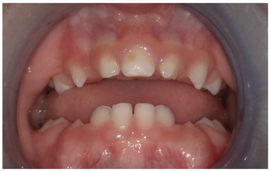 - Lygidakis, N.N.; Chatzidimitriou, K.; Petrou, N.; Lygidakis, N.A. Solitary median maxillary central incisor syndrome (SMMCI) with congenital nasal puriform aperture stenosis: Literature review and case report with comprehensive dental treatment and 14 years follow-up. Eur. Arch. Paediatr. Dent. 2013, 14, 417–423. [Google Scholar] [CrossRef]