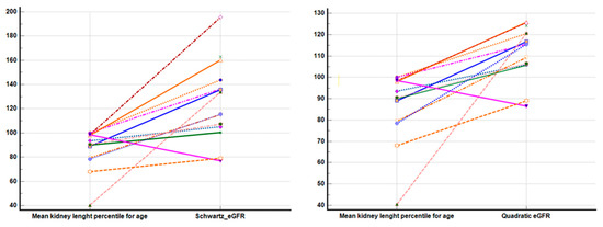 Follow-up was performed in half of the patients. Unexpectedly, when we employed both GFR equations, the Schwartz formula tended to overestimate the GFR, with a marked increase in the estimation when compared to the quadratic formula. These results underline that even though kidney enlargement was present, the renal function seemed to be preserved when the quadratic formula was applied (Figure 1). These results were further analyzed as delta differences between the estimated GFRs. At the initial presentation and at follow-up, the mean GFR was overestimating the renal function when comparing the Schwartz formula to the quadratic one (137.55 versus 118.08 mL/min/1.73 m2 at initial presentation and 145.05 versus 117.75 mL/min/1.73 m2 at the 1-year follow-up). While the Schwartz formula proved to increase over 1 year with a ΔeGFR = 7.51 ± 19.46 mL/min/1.73 m2, the quadratic formula showed an annual decrease in eGFR of 0.32 ± 5.78 mL/min/1.73 m2 (p = 0.019).