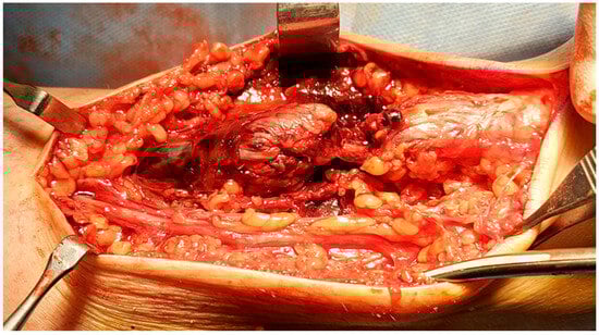 The intraoperative finding shows complete interruption of the Achilles tendon 2 cm at the calcaneal insertion. In addition to the areas of hemorrhagic infarction, there is a clear alteration of the macrostructure of the tendon.