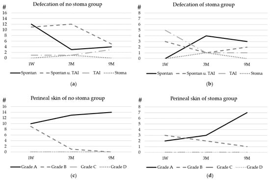 Postoperative bowel function and bowel management: the development of defecation of patients with (a) no stoma before surgery and (b) a stoma before surgery. (c) The development of the perineal skin condition in patients with no prior stoma and (d) the development of the perineal skin condition in patients with a prior stoma. For the graduation of the skin, please refer to Figure 1. Spontan = spontaneous defecation, TAI = transanal irrigation, and Stoma = defecation through stoma. Y-axe # Number of patients.