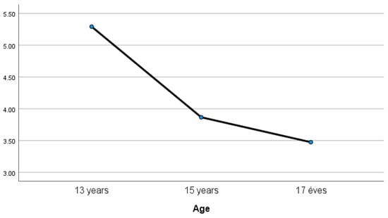 Life satisfaction decreased significantly with age (ANOVA, p = 0.018; Figure 2). On average, life satisfaction was 5.3 at age 13 and as low as 3.5 at age 17. Comparing genders, no significant association with life satisfaction was found (two-sample t-test, p = 0.762). On average, boys and girls had 3.9 and 4.1 levels of life satisfaction, respectively.