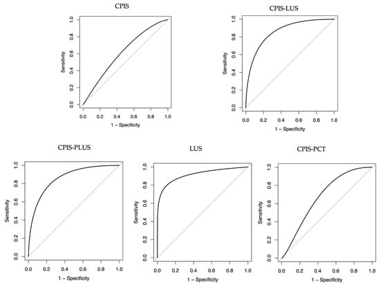 AUC CPIS, CPIS-LUS, CPIS-PLUS, LUS, and CPIS-PCT.
