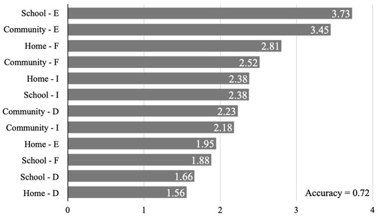 The random forest results are illustrated in Figure 1. Comparisons of the mean decreases in the Gini index for each PEM-CY item indicated that the school environment (3.73) and the community environment (3.45) had the highest impact on QOL, followed by home frequency (2.81), community frequency (2.52), home involvement (2.38), and school involvement (2.38). In addition, the mean accuracy of this model was 0.72 (72%).