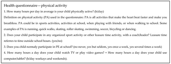 Parents’ estimations of the children’s activity levels were collected from a health questionnaire (Figure 1). The three main outcomes used in this study were estimated daily PA (h/day), estimated screen time (h/day), and child’s participation in organised sport held by a leader (yes/no). The parents were asked about their children’s participation in physical education at school (No; Yes, but seldom; Yes, once a week; Yes, several times a week).