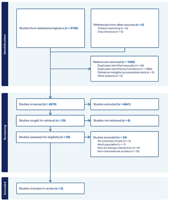 The search strategy yielded 5756 studies (see Figure 2. PRISMA flowchart of the screening process). Using Covidence, 1062 duplicates were removed, and an additional 24 duplicates were identified manually, resulting in 4670 studies to be screened. After screening titles and abstracts alone, 29 were selected for full-text screening. Of the 29 full-text studies, 24 were excluded due to being non-interventional (10), art-based activities not meeting the definition of art therapy (8), non-pain related outcomes (5), and adult population (1). Five studies were included in the final analysis, and the results are reported below.