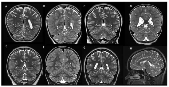 Coronal (A–G) and sagittal (H) T2-weighted images of 8 patients with tuberous sclerosis demonstrating mild diffuse cerebellar atrophy with widening of the cerebellar fissures.